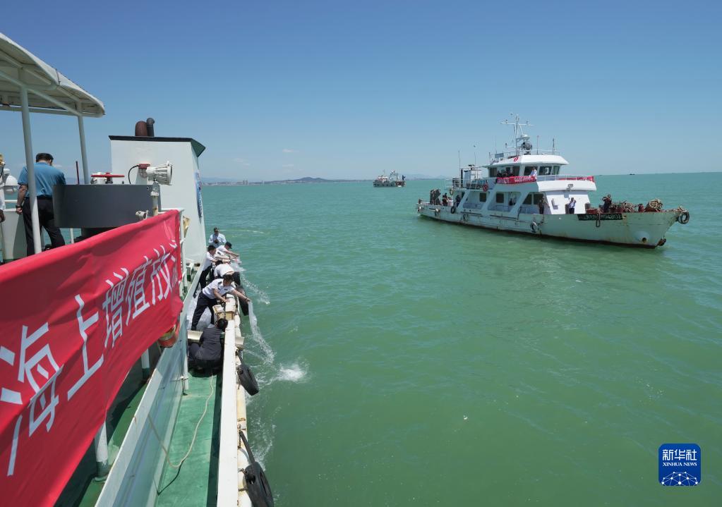 6月2日,參加增殖放流活動的人員在秦皇島市北戴河新區海洋漁業資源增殖放流基地海域投放魚苗。