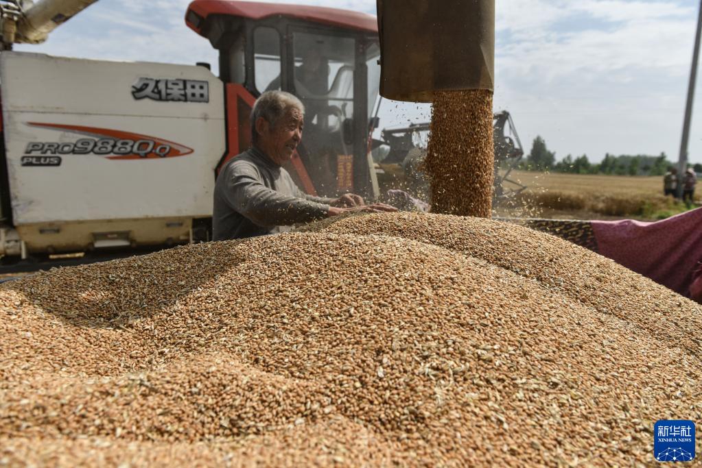 6月2日,村民在安徽省阜陽市臨泉縣呂寨鎮楊莊村麥田里收獲小麥。