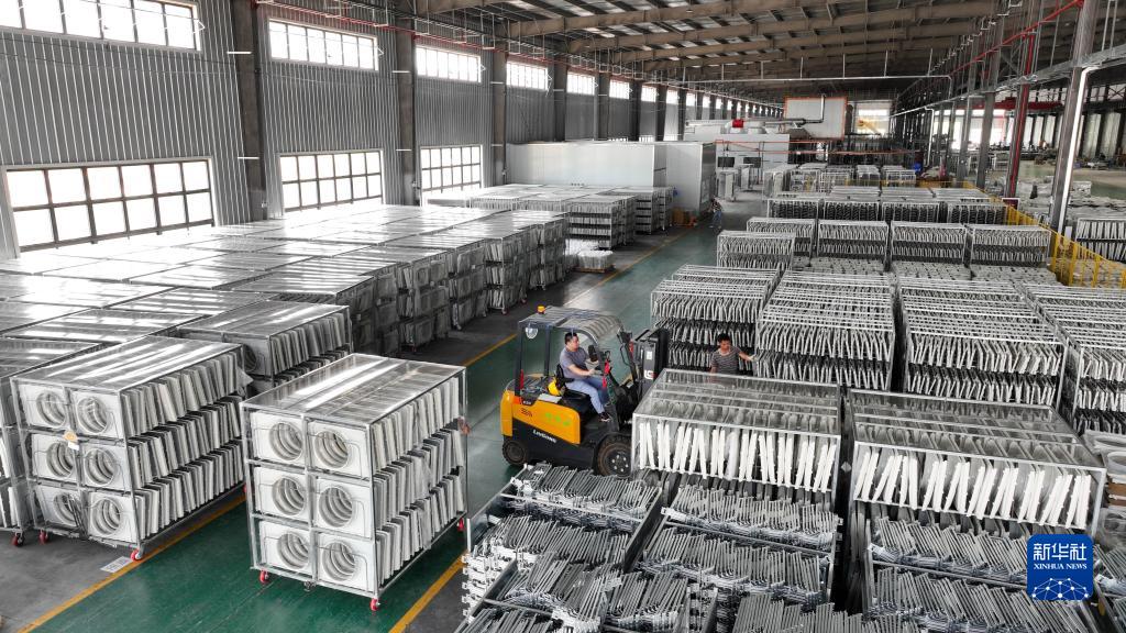 6月2日,工人在柳江區一家空調企業鈑金倉庫里轉運剛下線的空調零部件(無人機照片)。