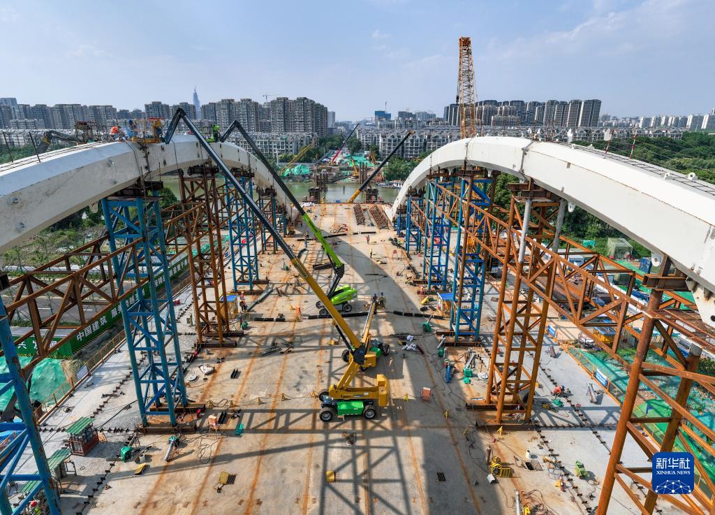 這是6月2日拍攝的南京梅苑南路跨秦淮新河大橋施工現場(無人機照片)。