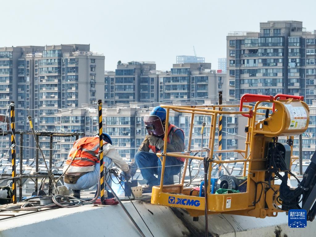 6月2日,中建三局的工程人員在南京梅苑南路跨秦淮新河大橋施工現場進行焊接作業(無人機照片)。