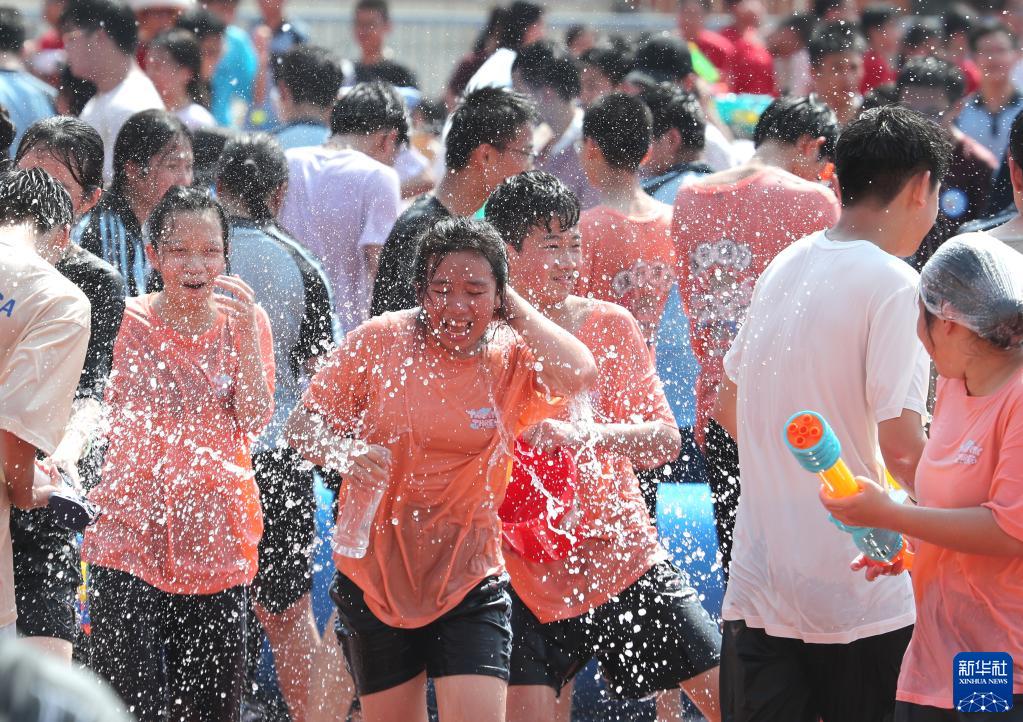當日,廣西南寧市第三中學初中部青秀校區組織1500多名初三學生,在校園舉行潑水活動,以獨特方式讓學生們減輕考前壓力。