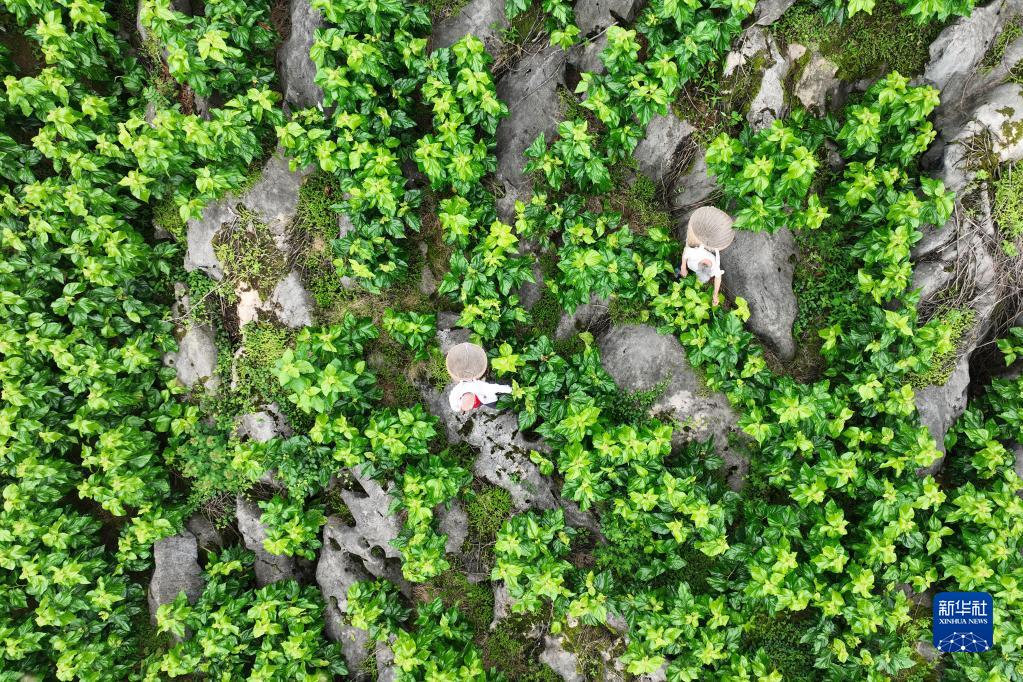 6月2日,重慶市黔江區濯水鎮雙龍村村民在石漠化蠶?;毓茏o桑樹(無人機照片)。