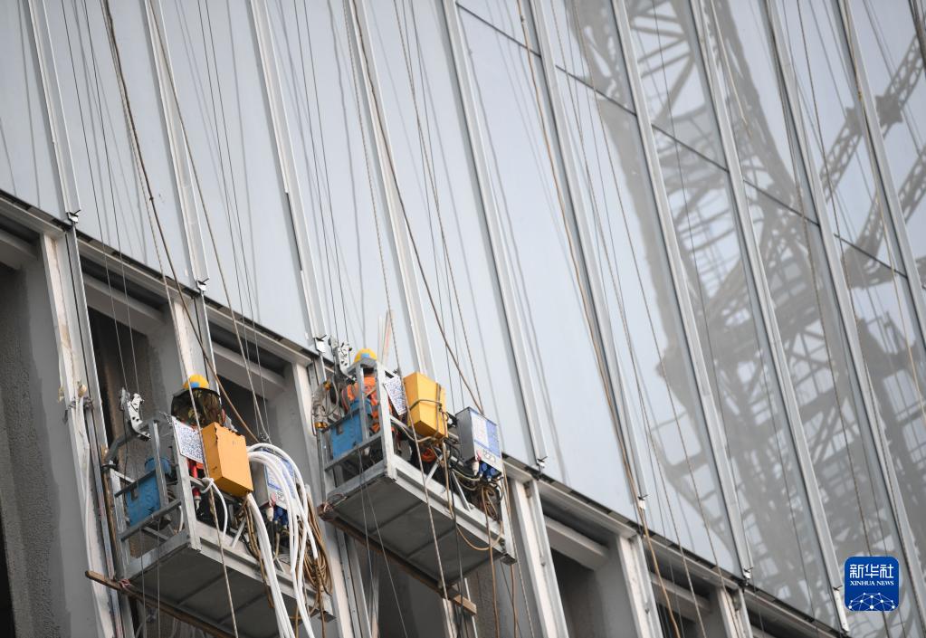 6月2日,工人在白鵝潭大灣區藝術中心進行幕墻施工。