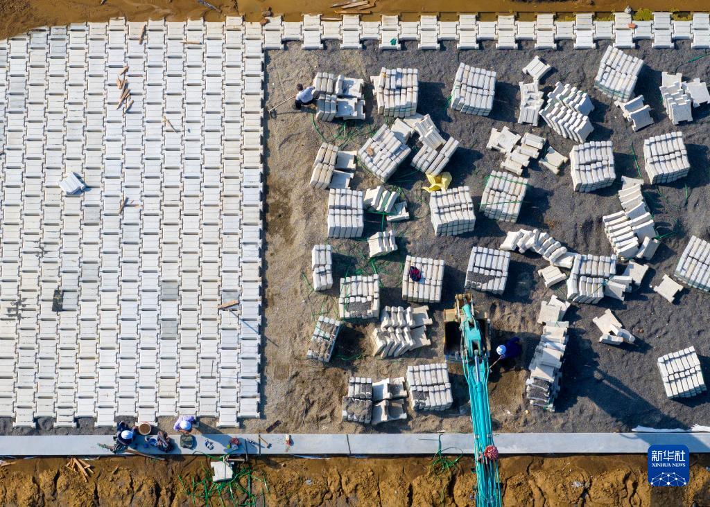 6月2日,工人在淮河入海水道二期工程淮安市先導段鋪設護坡(無人機照片)。