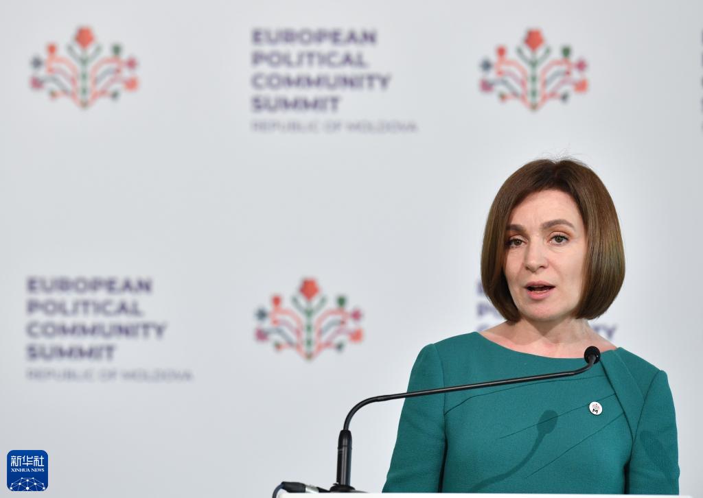 6月1日,在摩爾多瓦布爾博阿克,摩爾多瓦總統桑杜在第二屆歐洲政治共同體領導人會議后參加新聞發布會。