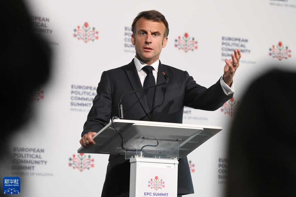 6月1日,在摩爾多瓦布爾博阿克,法國總統馬克龍在第二屆歐洲政治共同體領導人會議后參加新聞發布會。
