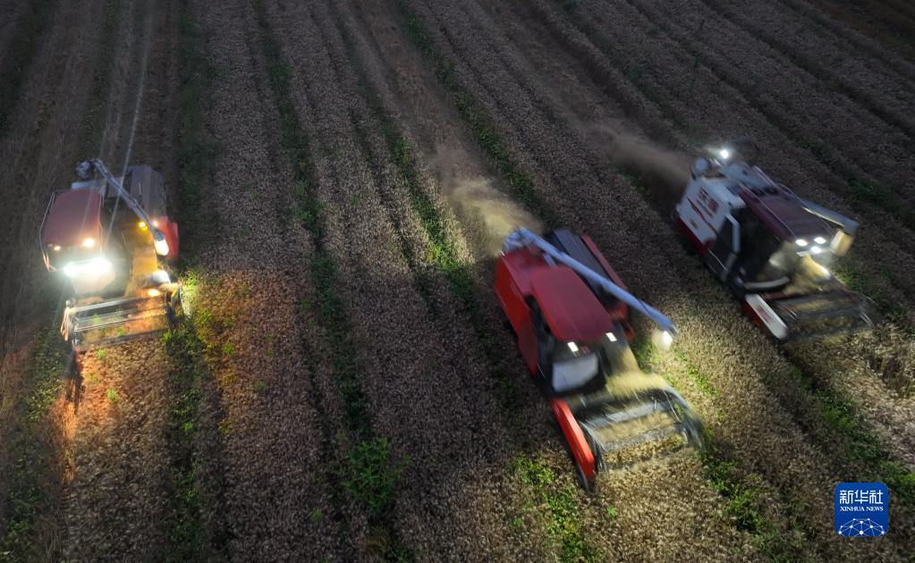 6月2日晚,農民在浙江省湖州市德清縣阜溪街道龍勝村駕駛農機收獲小麥(無人機照片)。