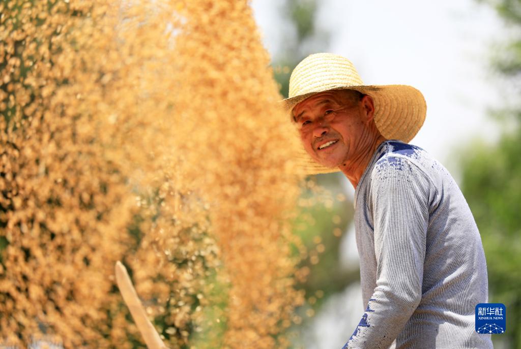 6月3日,安徽省淮北市烈山區古饒鎮谷山村村民在晾曬收獲的小麥。