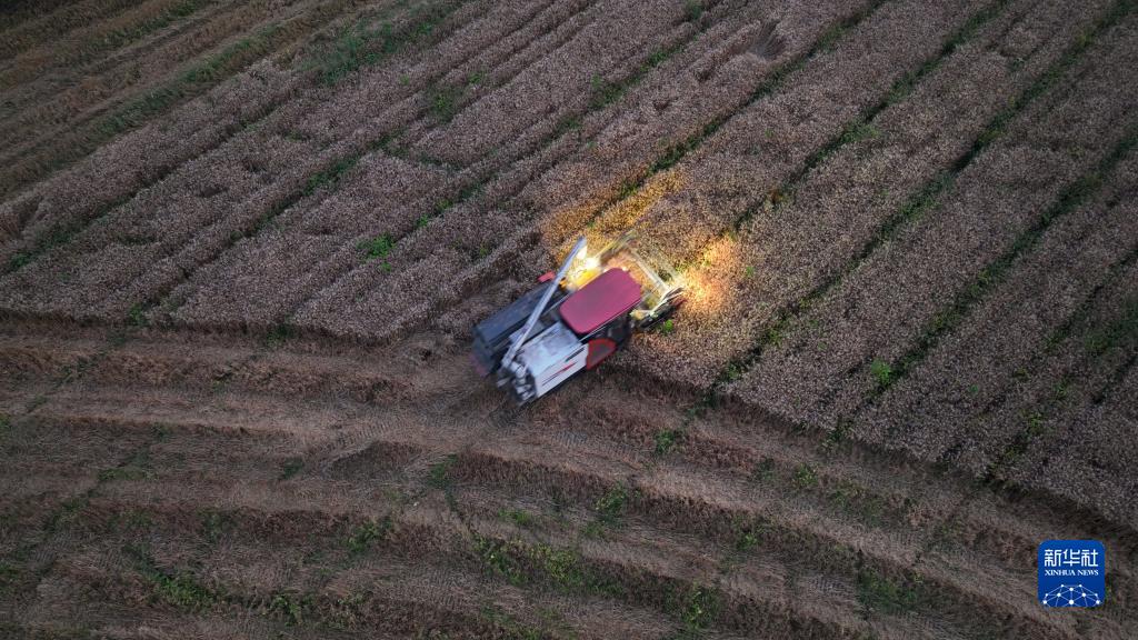 6月2日晚,農民在浙江省湖州市德清縣阜溪街道龍勝村駕駛農機收獲小麥(無人機照片)。