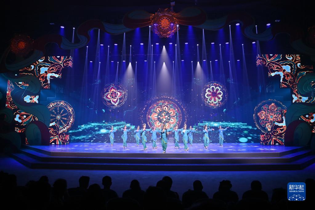 這是6月2日在新疆阿克蘇地區庫車市拍攝的歌舞劇“杏花之約 絲路龜茲”演出現場。