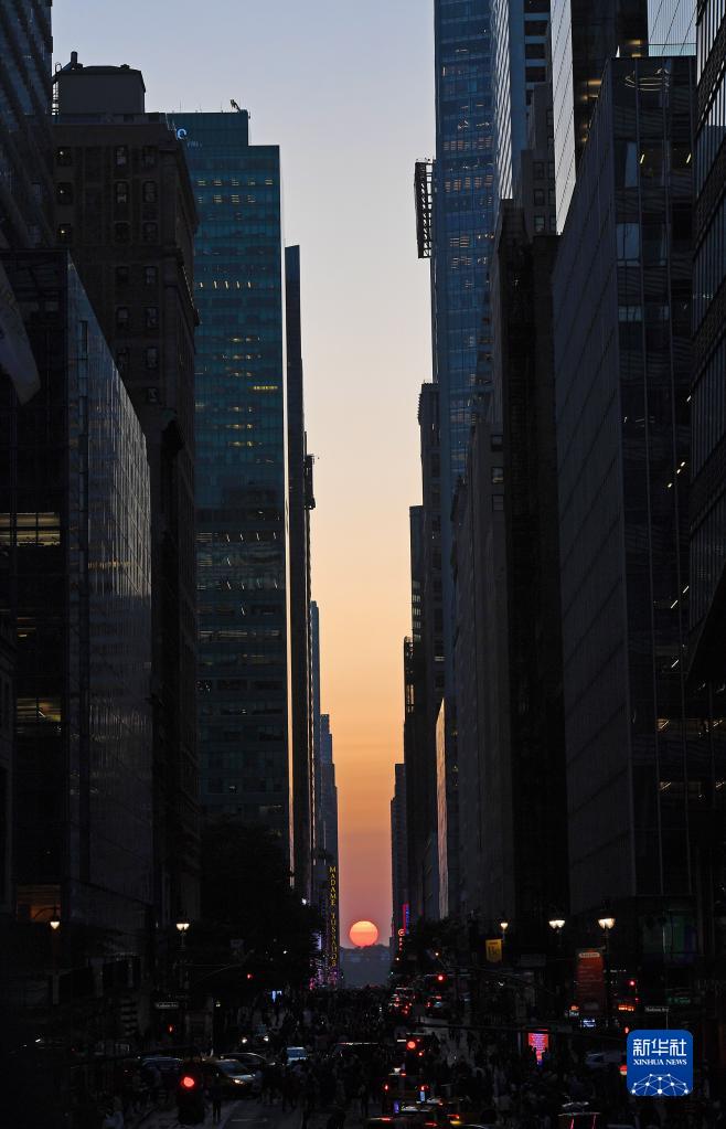 當日,紐約出現“曼哈頓懸日”景觀?!奥D懸日”是紐約市標志性景觀,每年5月和7月出現兩次,指日落時太陽正好出現在曼哈頓東西向街道正上方、似乎懸在兩側高樓大廈之間的戲劇性畫面。