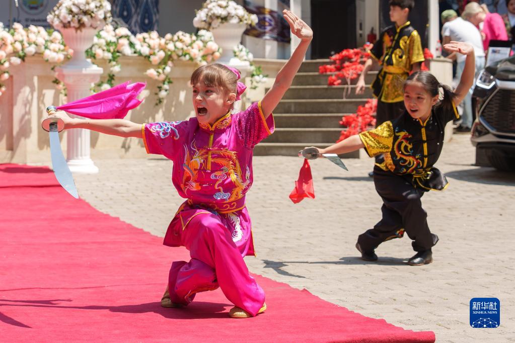 5月27日,小演員在烏茲別克斯坦首都塔什干的中央公園表演武術。