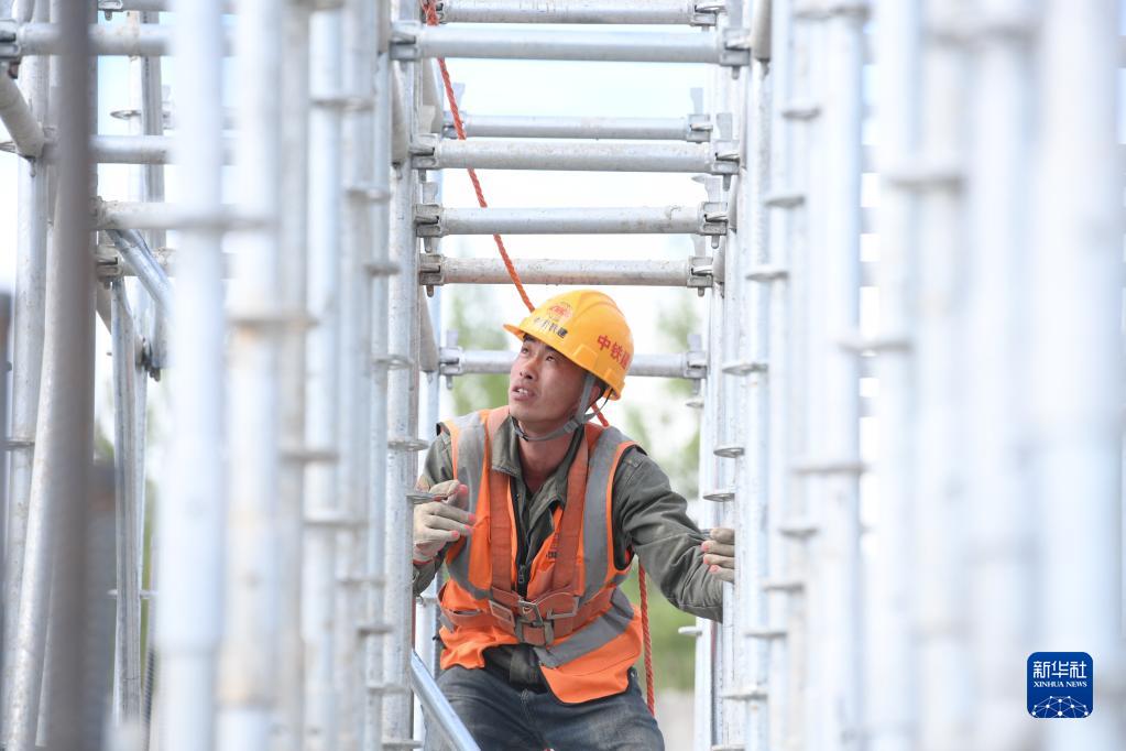 在伊春西站主體結構施工現場,工人在建設作業(6月2日攝)。