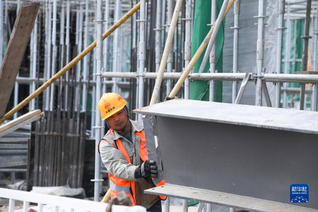 在伊春西站主體結構施工現場,工人在建設作業(6月2日攝)。