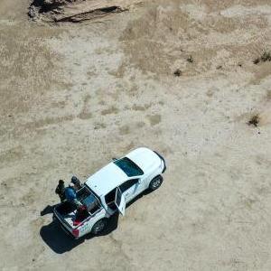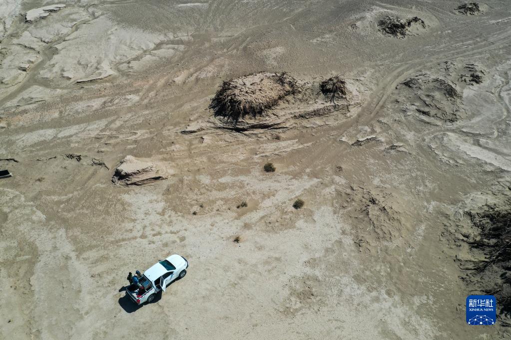 6月2日,額濟納旗文物保護中心工作人員在戈壁灘上巡護(無人機照片)。