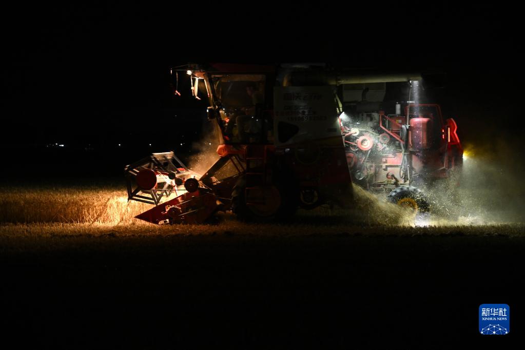 6月2日夜晚,在阜陽市阜南縣苗集鎮的一處麥田,農機手駕駛收割機收割小麥。