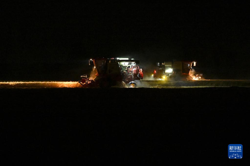 6月2日夜晚,在阜陽市阜南縣苗集鎮的一處麥田,農機手駕駛收割機收割小麥。