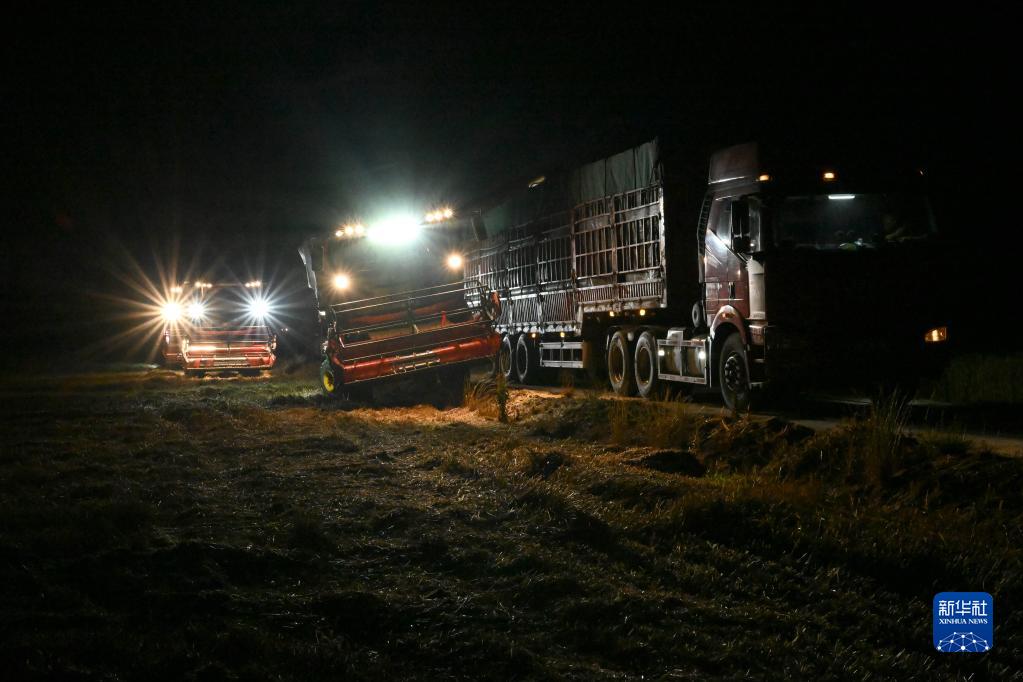 6月2日夜晚,在阜陽市阜南縣苗集鎮的一處麥田,農機手駕駛收割機將收獲的小麥裝車。