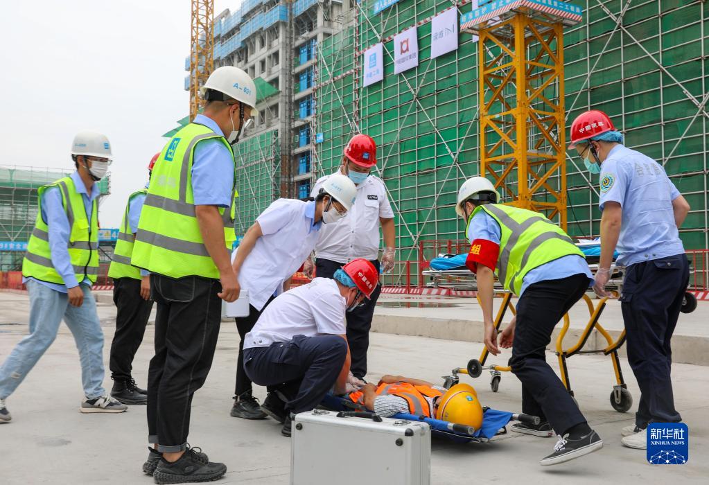6月3日,中建二局的員工與醫護人員在進行應急救援演練。