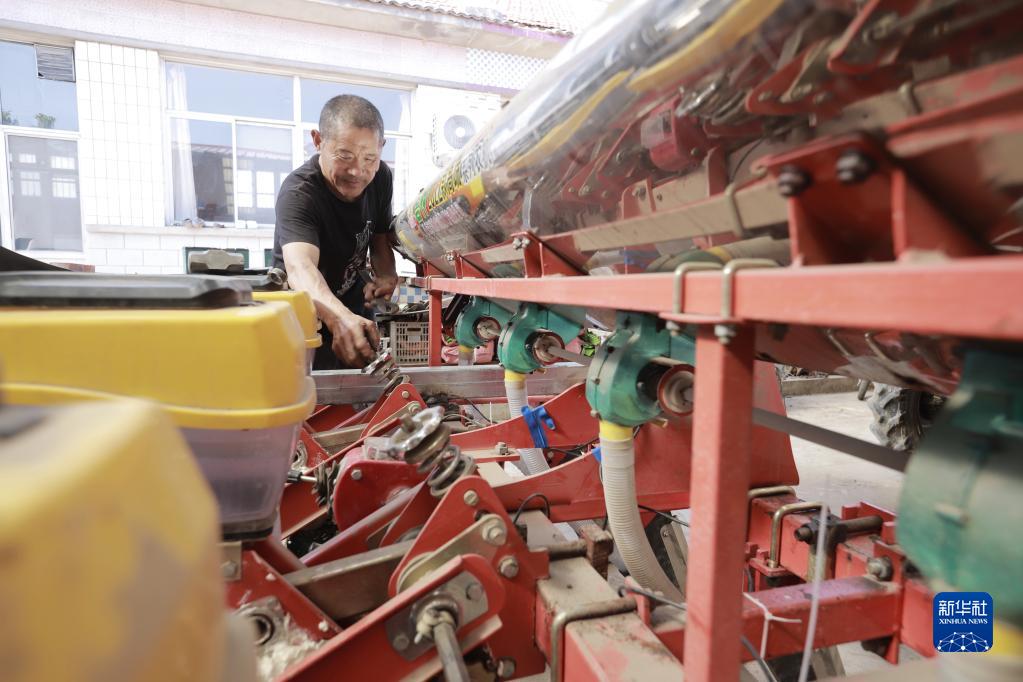 6月2日,在河北省唐山市豐潤區石各莊鎮一家農機專業合作社,農機手在檢修播種機。