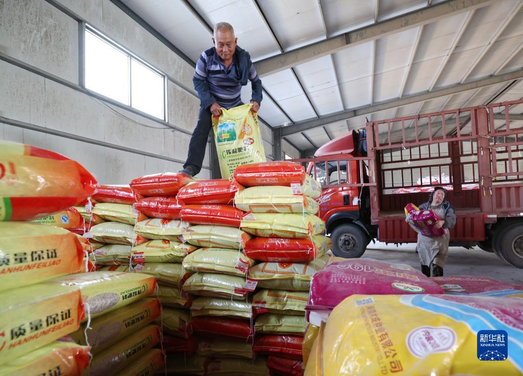6月3日,河北省晉州市一家農資銷售公司的工人在庫房碼放農資。