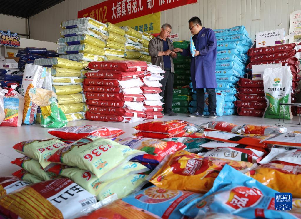 6月3日,河北省晉州市一家種子銷售站的工作人員(右)向采購種子的農民介紹玉米種子的特點。