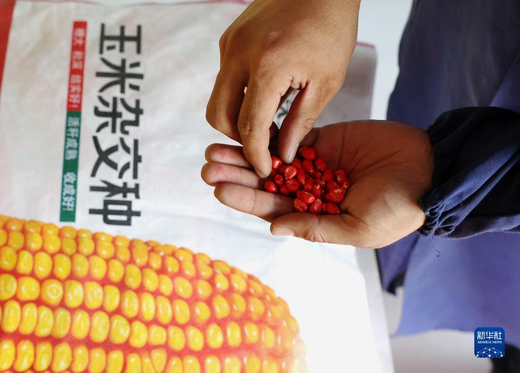 6月3日,在河北省晉州市一家種子銷售站,工作人員展示玉米種子。