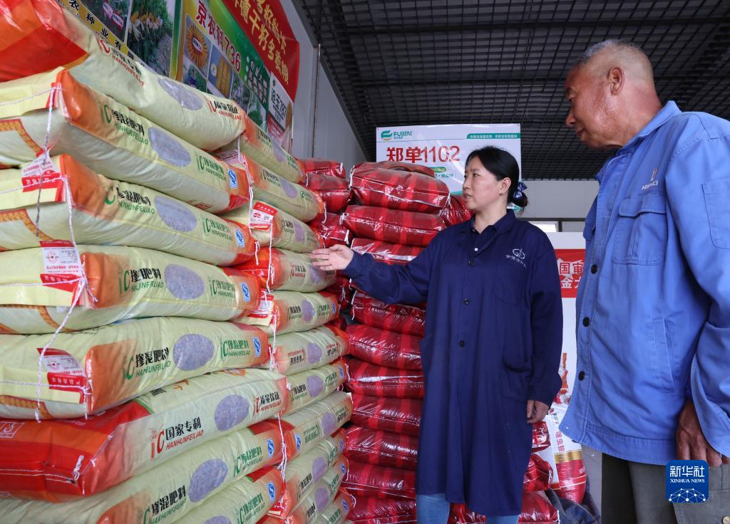 6月3日,河北省晉州市一家種子銷售站的工作人員(左)向采購種子的農民介紹玉米種子的特點。