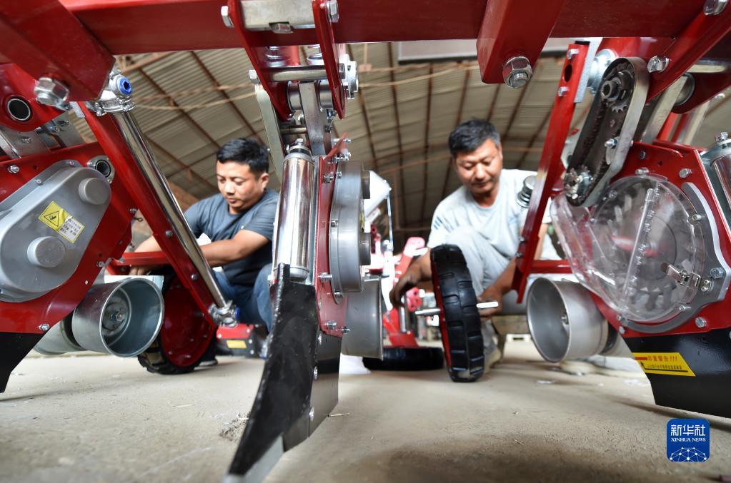 6月2日,在河北省石家莊市深澤縣一家農機銷售點,工作人員安裝播種機。