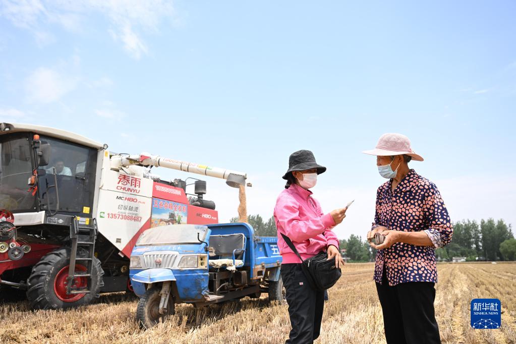 6月2日,在安徽省阜陽市阜南縣許堂鄉劉崗村,陳麗娟和村民確認收割費用。