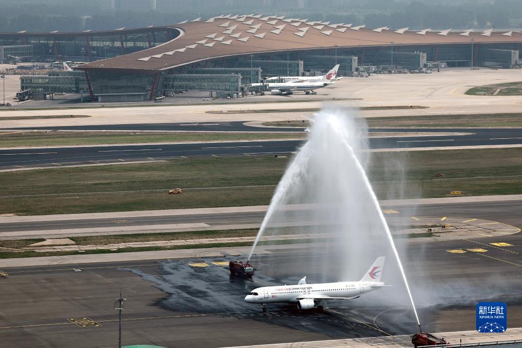 5月28日,北京首都國際機場以水門禮迎接C919首個商業航班東航MU9191。