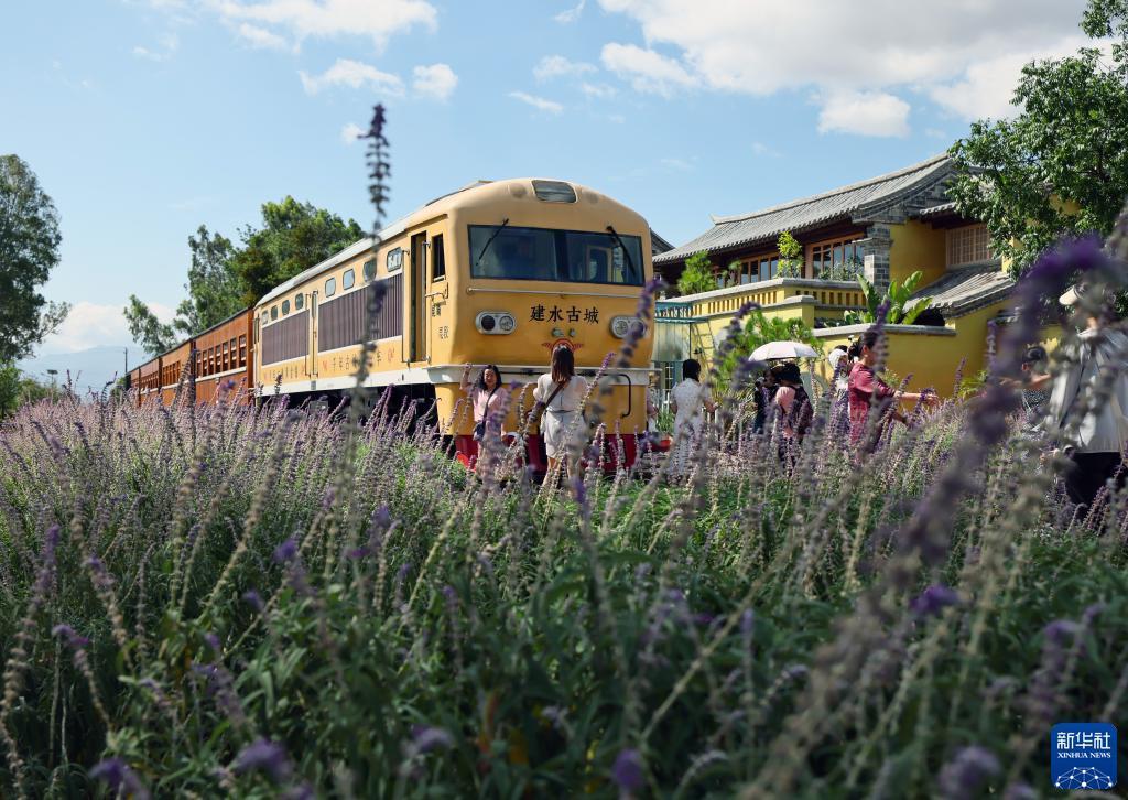 6月3日,游客在建水小火車鄉會橋站游覽、拍照。