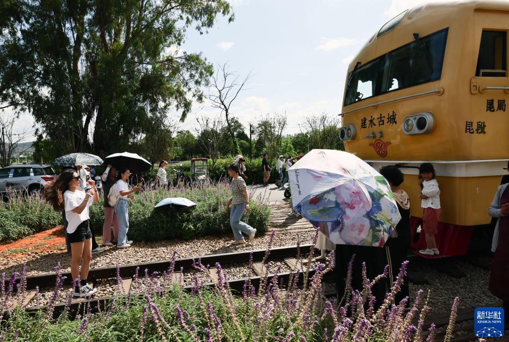 6月3日,游客在建水小火車鄉會橋站拍照。