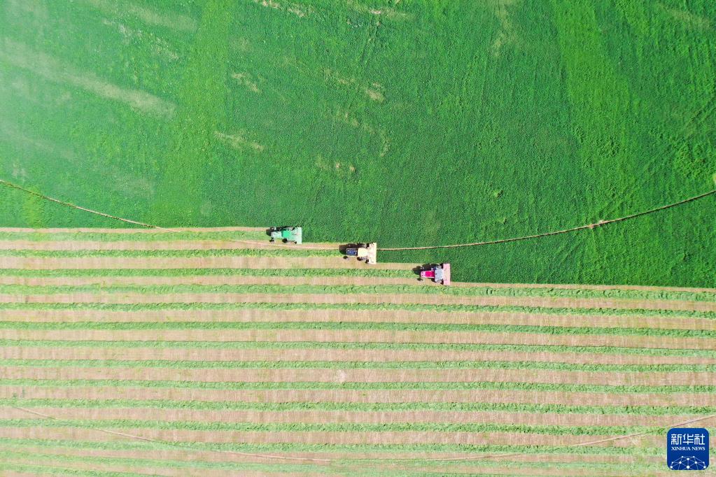 6月4日,在土默特左旗國家現代農業示范區內,機械車輛在收割苜蓿(無人機照片)。