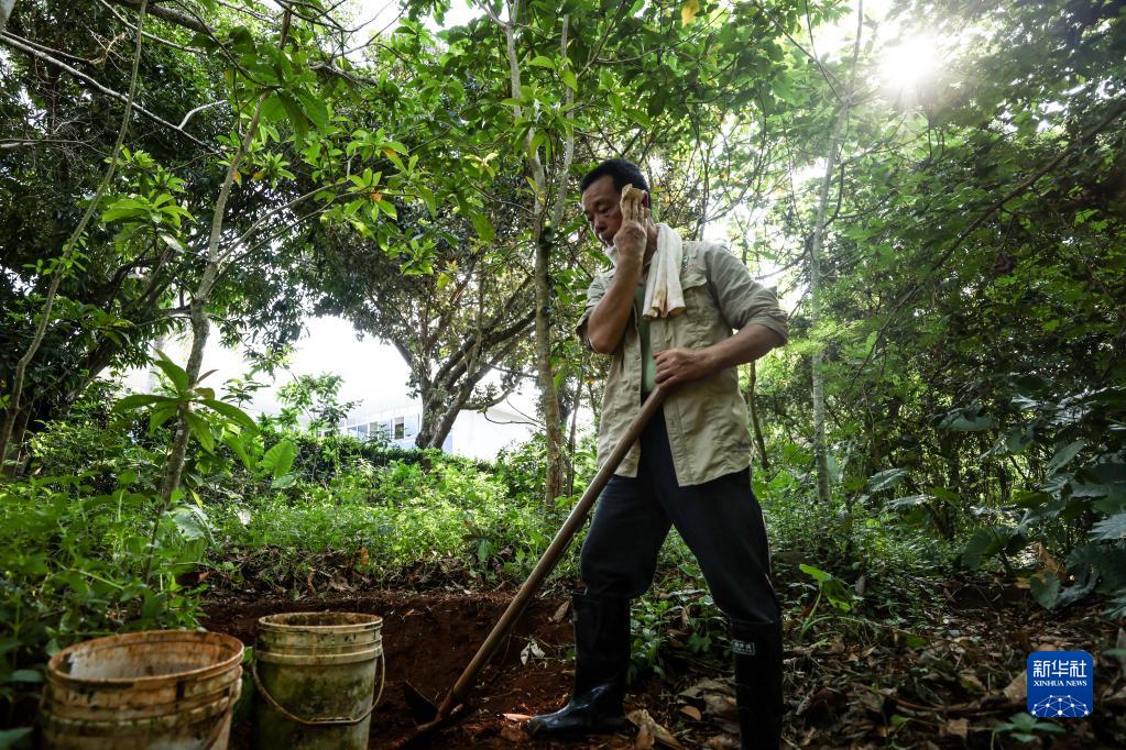 6月2日,在海南東寨港國家級自然保護區的苗圃內,王式軍在工作間隙擦拭汗水。