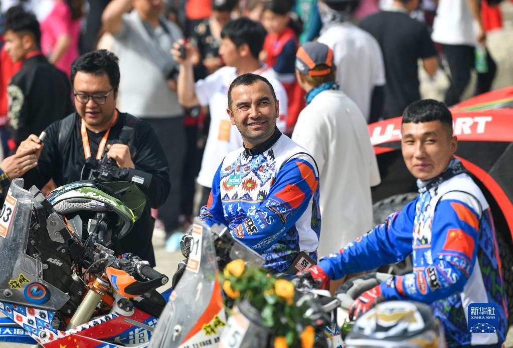 6月1日,在新疆和田地區約特干故城景區,環塔拉力賽參賽代表扎克爾·牙克甫(中)和隊友一起參加旅游展示活動。