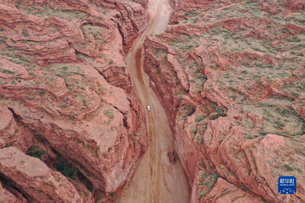 5月21日,參與2023年環塔拉力賽的賽車疾馳在新疆阿克蘇地區溫宿縣大峽谷(無人機照片)。
