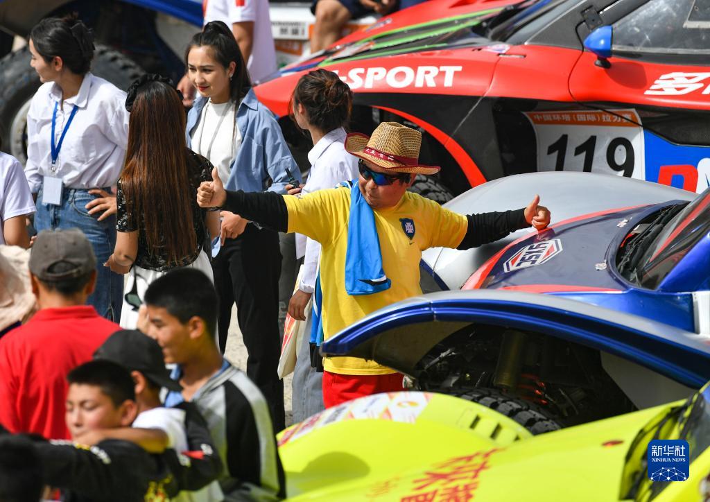 6月1日,在新疆和田地區約特干故城景區,游客參觀2023年環塔拉力賽參賽車輛。