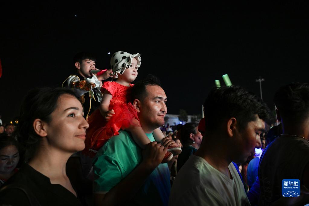 5月22日,在新疆喀什地區麥蓋提縣N39°沙漠旅游景區,當地居民觀看環塔拉力賽歡迎晚會上的文藝表演。