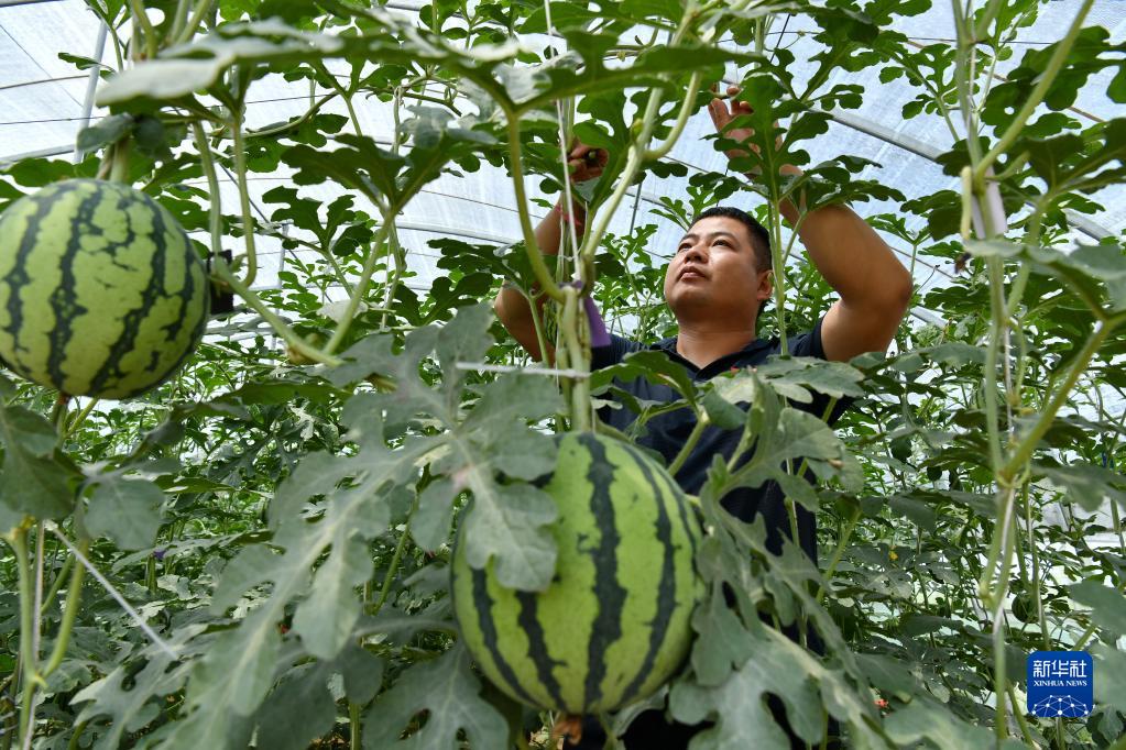 6月4日,農民在獻縣河城街鎮梅莊洼農場大棚內管理種植的西瓜。