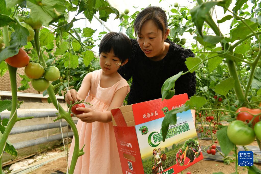 6月4日,游客在獻縣河城街鎮梅莊洼農場大棚內采摘西紅柿。