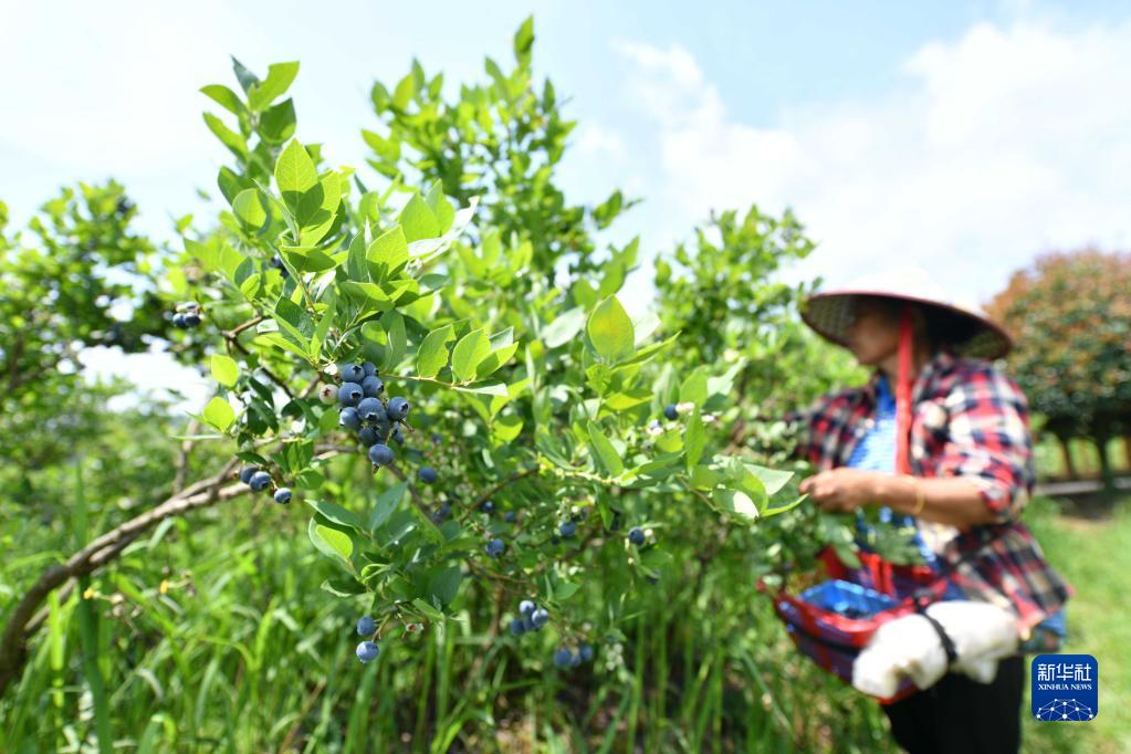 6月4日,村民在貴州省麻江縣藍夢谷生態藍莓園采摘藍莓。