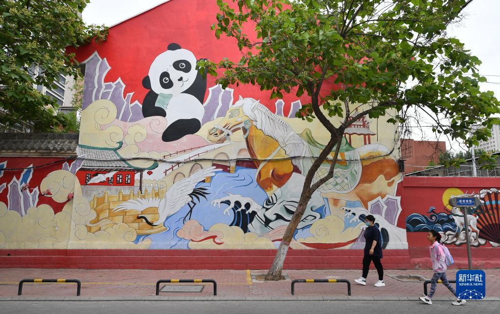 6月4日,市民經過銀川市興慶區教育巷特色墻繪。
