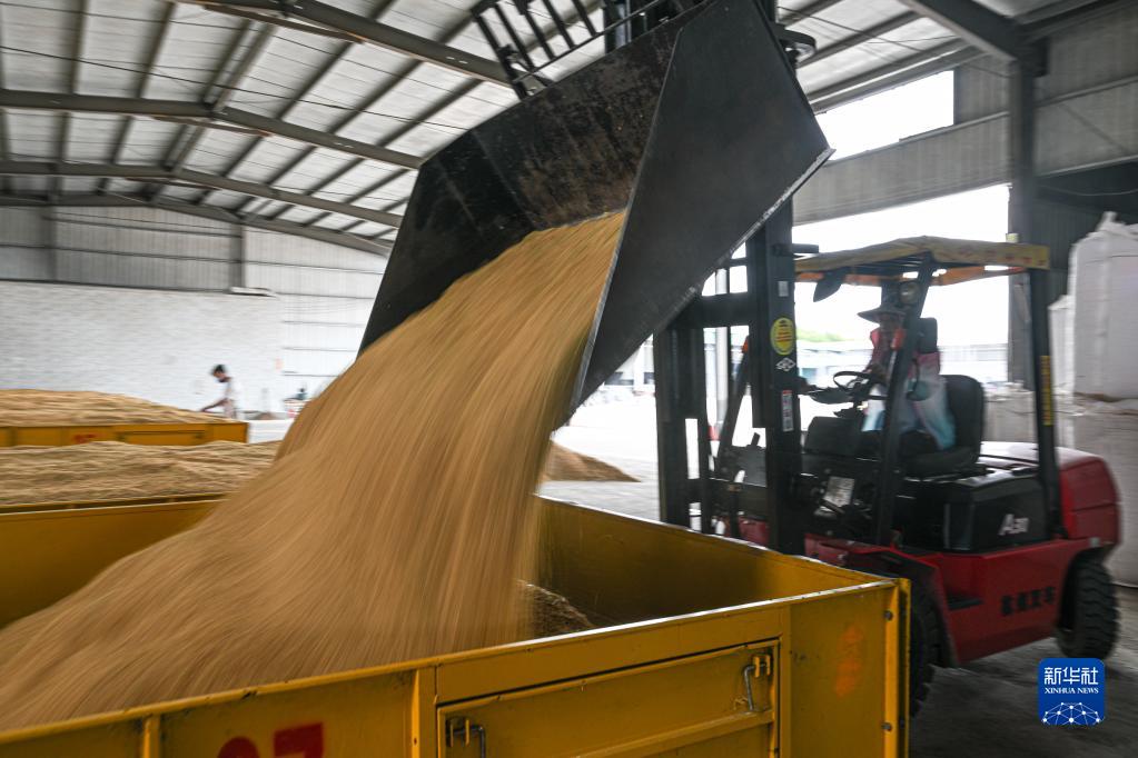 6月4日,在位于海南省東方市的海南農樂南繁科技有限公司制種基地,工人駕駛叉車將收獲的稻種運入烘干倉。