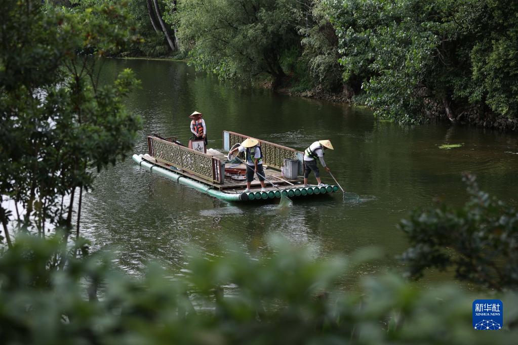 6月4日,在貴州省黔東南苗族侗族自治州丹寨縣萬達小鎮東湖景區,志愿者在打撈景區湖面上的漂浮物。