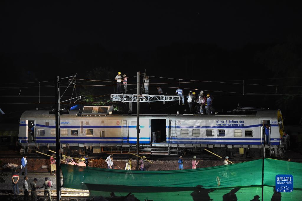 6月4日,救援人員在印度奧迪沙邦巴拉索爾地區的列車脫軌相撞事故現場工作。