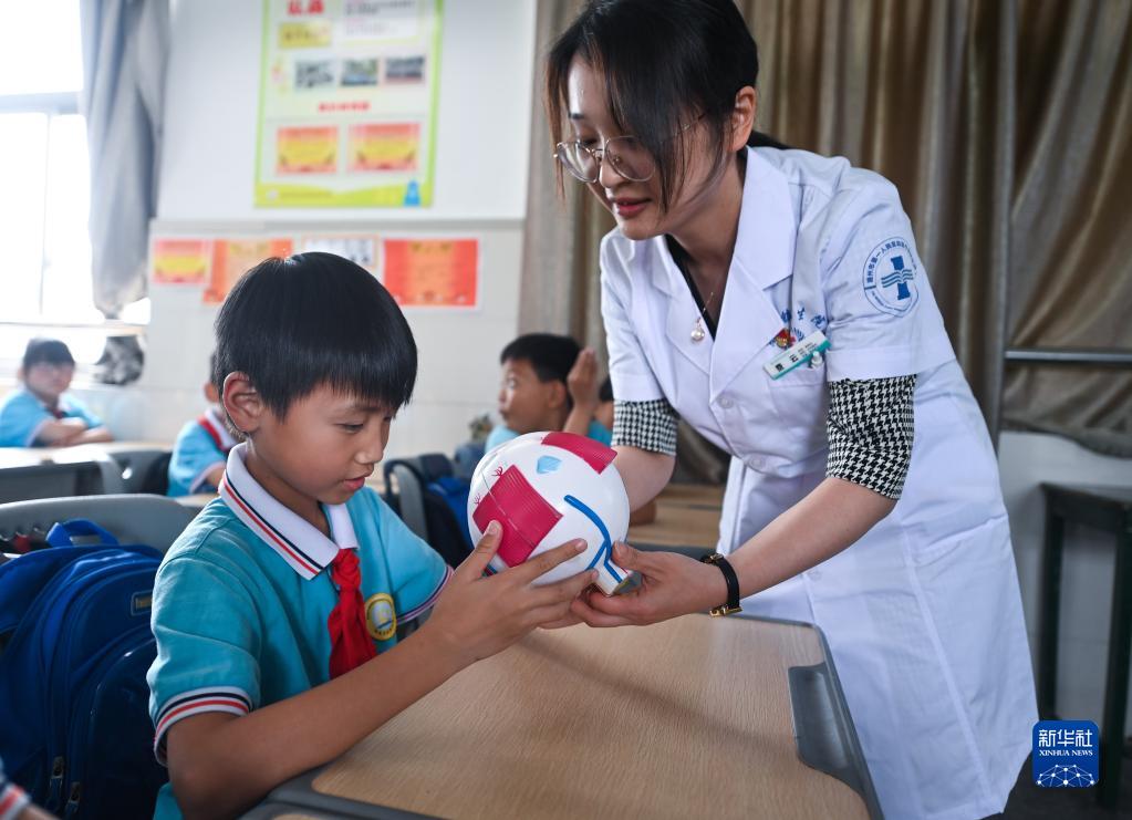 6月5日,東林鎮衛生院的醫生給小學生們介紹眼球結構。