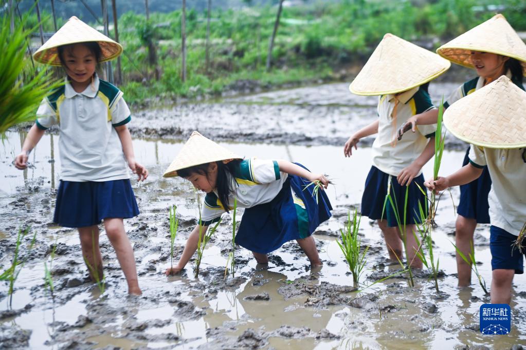 6月5日,孩子們在道場鄉格林農莊的稻田里體驗插秧。