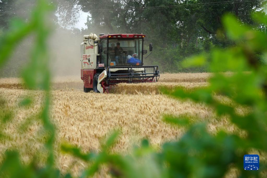 6月5日,聯合收割機在河北省沙河市下鄭村收割小麥。